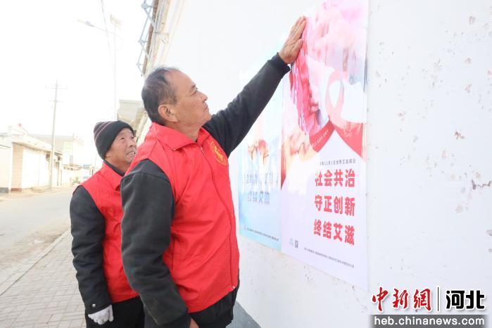 图为在南宫市明化镇前刘邱村,志愿者在张贴防艾宣传海报。 田优 摄