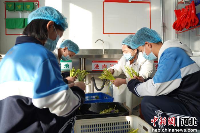 图为内丘县第二中学学生在食堂后厨体验摘菜。 谢亚男 摄
