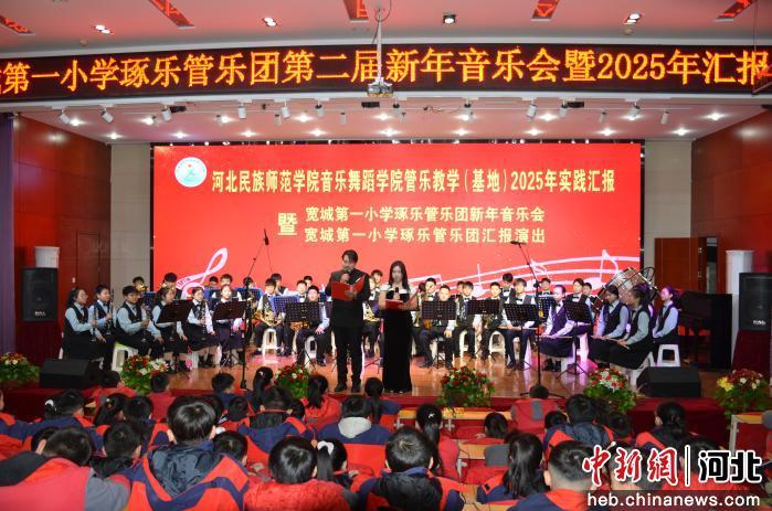 中新网河北新闻1月27日电 (袁宝利 刘小静)25日,河北省承德市宽城满族自治县第一小学多功能厅内暖意融融、掌声阵阵。小号清亮高亢,长笛悠扬婉转,单簧管灵动俏皮……该校第二届“琢乐”管乐团新年音乐会正精彩上演。