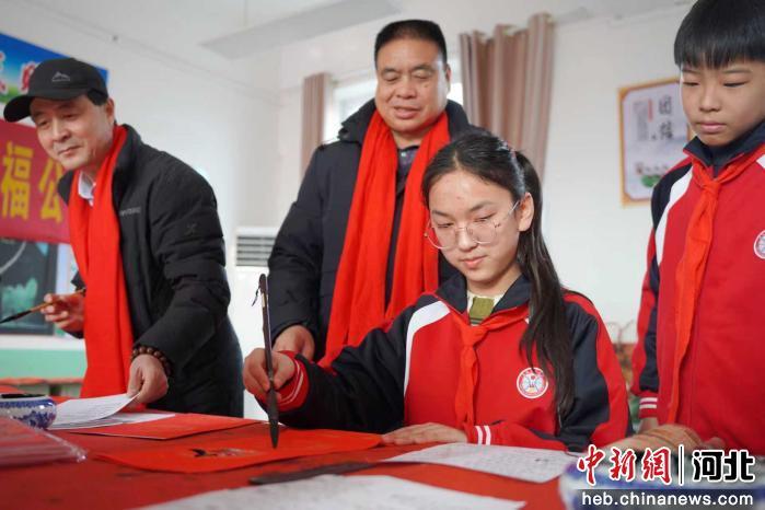 图为内丘县北岭中心小学学生在书写对联。 刘媛媛 摄