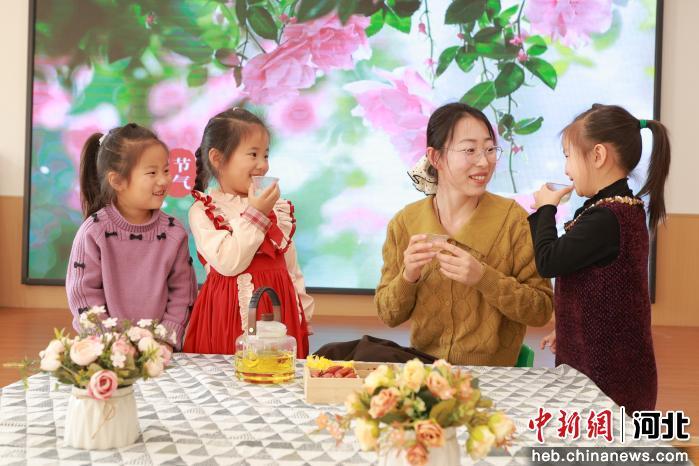图为内丘县幼儿园的孩子们在老师的带领下品春茶。 刘继东 摄