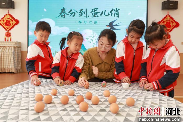 图为内丘县幼儿园的孩子们在老师的指导下体验“春分立蛋”。 刘继东 摄