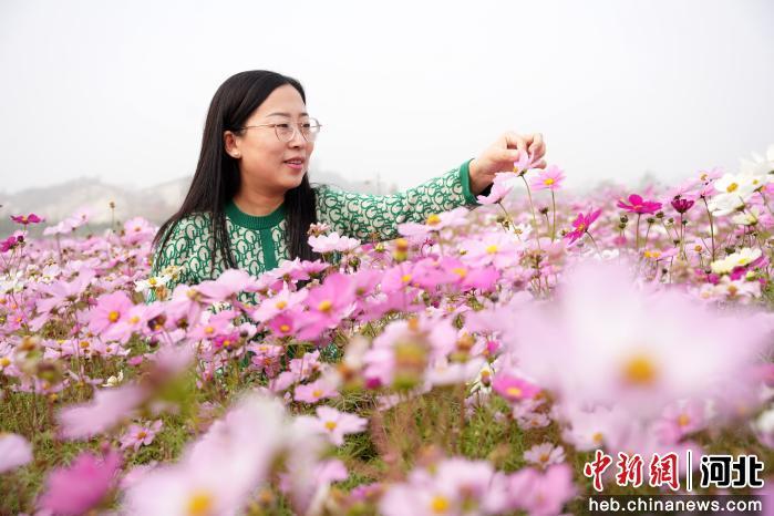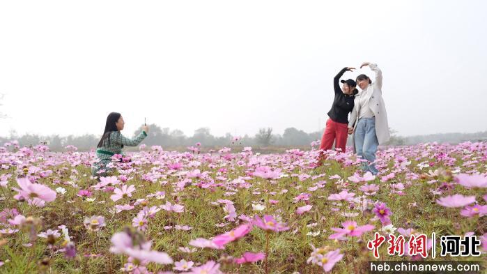 图为游客在河北省隆尧县尧山的格桑花海中拍照打卡。  张冬茹 摄