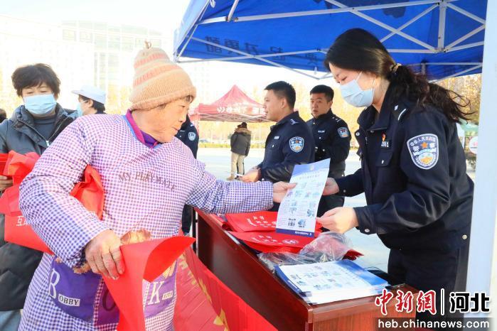图为在南宫市人民广场,民警向市民宣传反诈知识。 田优 摄