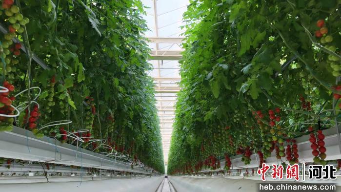 中新网河北新闻12月10日电 (王天译 柏瑞楠)10日,河北省邯郸市大名县智慧农业科技产业园樱桃番茄种植基地内,工作人员正在对樱桃番茄进行落蔓处理。