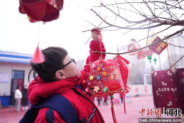 图为3月5日,在河北省隆尧县第五实验小学,学生正在将春节主题作品悬挂在树上。 郭泽鑫 摄