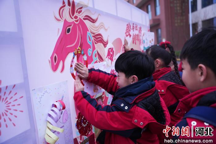 图为3月5日,在河北省隆尧县第五实验小学,学生们正在“骏马驰骋 创造骐骥”主题幕布前粘贴创意剪纸。 郭泽鑫 摄