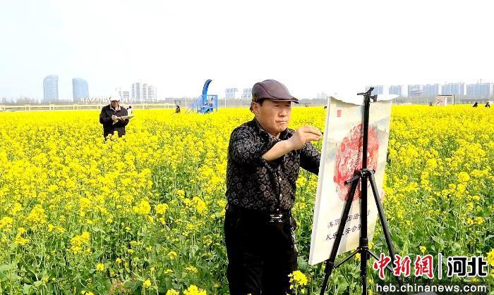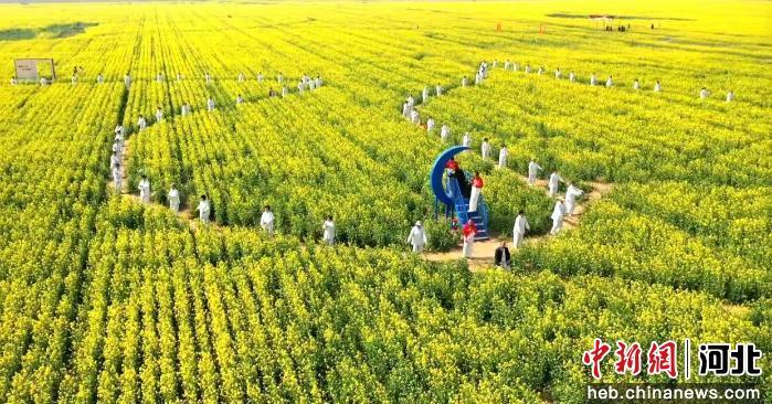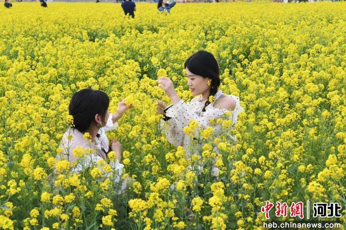 中新网河北新闻4月7日电 (武成军 许朋钰)7日上午,走进河北省邯郸市成安县千亩油菜花核心观赏区,金黄色油菜花竞相开放,吸引众多周边市民和游客前来踏春游玩,成为冀南大地新晋网红打卡地。