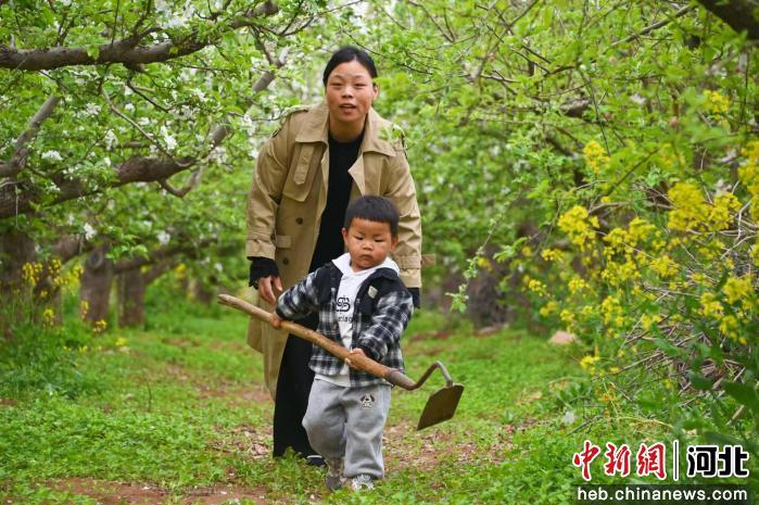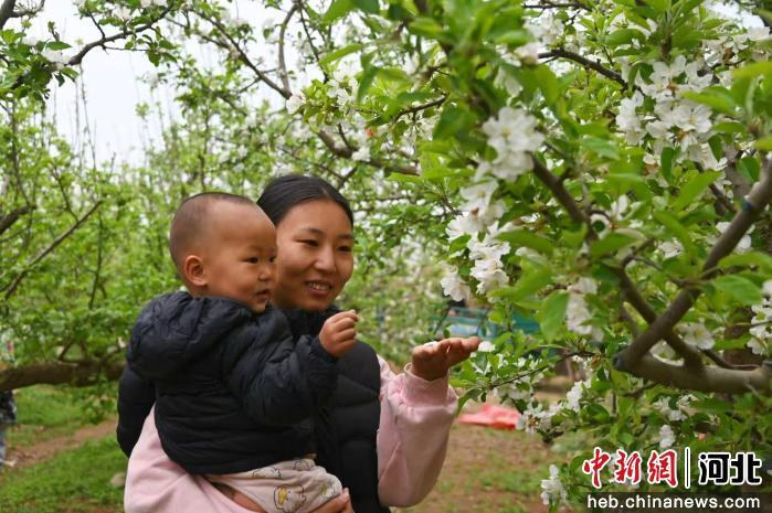 图为游客抱着孩子在树下赏花,近距离感受春日果园的美好。 赵子斌 摄