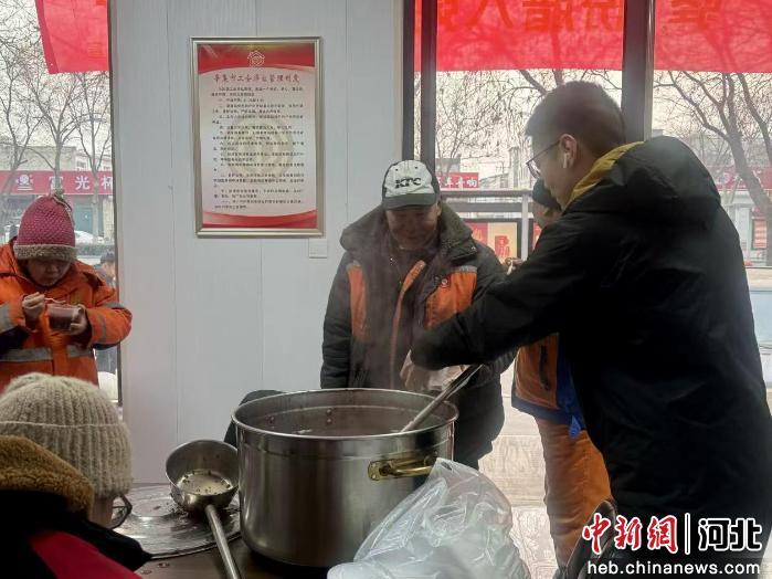 辛集农商银行为环卫工人、外卖小哥、快递员等户外劳动者送上腊八粥。 刘盈序 摄