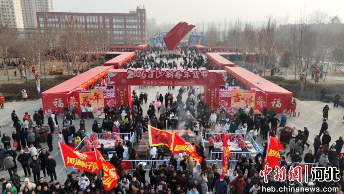 中新网河北新闻2月10日电 (焦洛 王丽华 韩晓欧)近日,太行东麓的平山县人民公园热闹非凡,两股热潮相映生辉、暖意涌动。一侧,“平山红”拔河超级联赛四强赛激战正酣,队员们紧握长绳、重心后倾,“团结起来,寸步不让”的呐喊震彻云霄,绳索上的红色标记在两队间反复拉锯,尽显“拧成一股绳”的拼搏韧劲;另一侧,新春年货节烟火气十足,炸年糕的焦香、手写春联的墨香与孩童追玩萌宠的笑声交织,勾勒出年味渐浓的热闹图景。