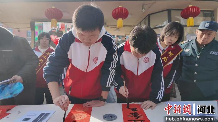 中新网河北新闻2月12日电 (韩晓欧 李崇姿 朱琳娜)2月11日,石家庄市赵县中学开展“新春送春联”公益活动,书法社团师生在校门口挥毫泼墨,免费为群众书写并赠送春联与福字。