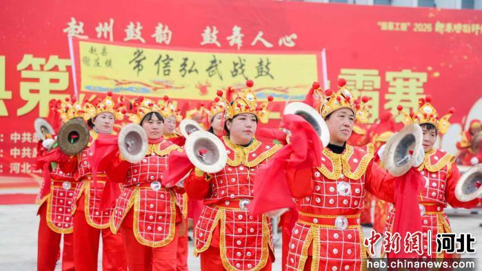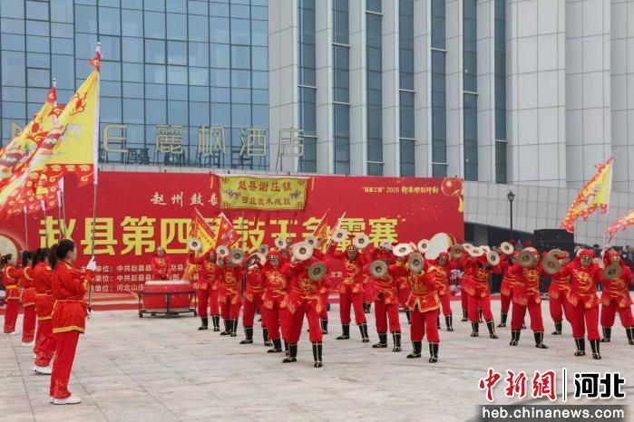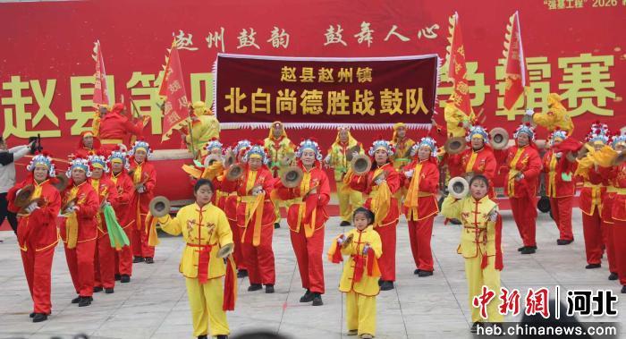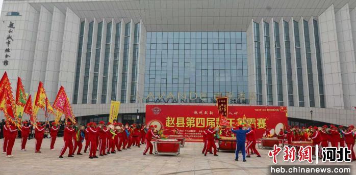 中新网河北新闻3月3日电(韩晓欧 李崇姿 朱琳娜)3月3日,农历正月十五,石家庄市赵县第四届鼓王争霸赛在赵州城市综合馆西广场隆重开幕。来自全县9支优秀民间鼓队齐聚一堂、同台竞艺。