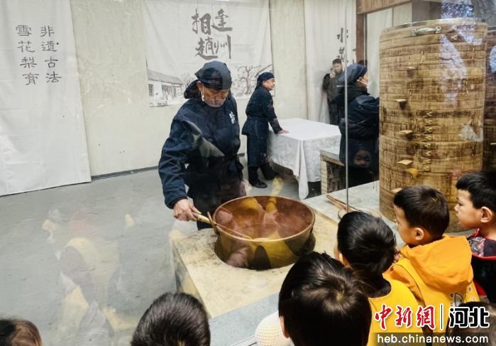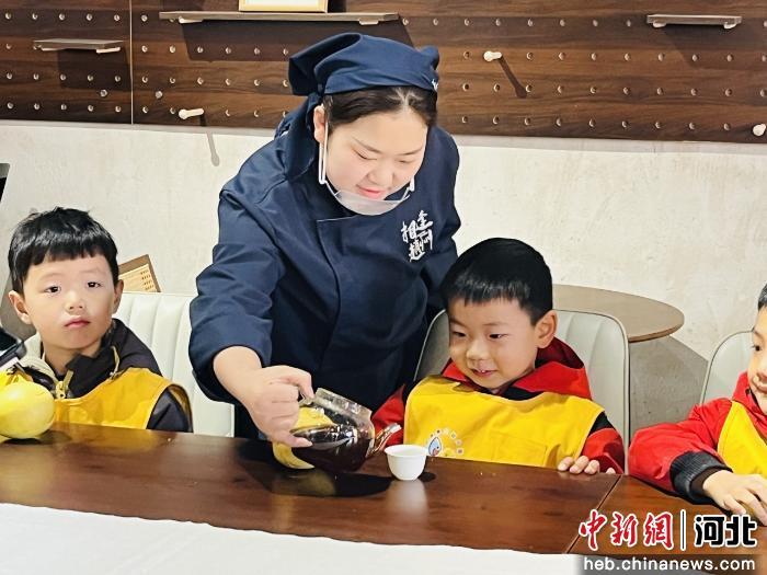 活动现场,“相逢赵州”共富工坊工作人员为孩子们讲解了“御梨膏”的故事,在非遗技艺情景再现展区,孩子们参观了赵州古法梨膏的制作过程,了解雪花梨膏“水蒸火熬、十炼成膏”的古法工艺,感受藏在梨膏里的食养智慧。