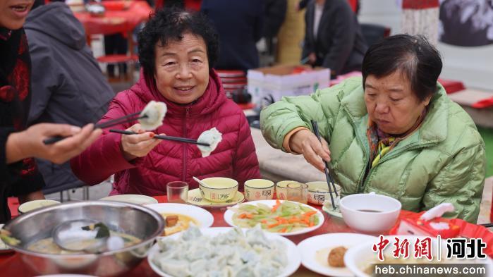 图说:在宁晋县上城嘉苑社区重阳节活动上,老人们正在品尝刚出锅的饺子。 李策 摄