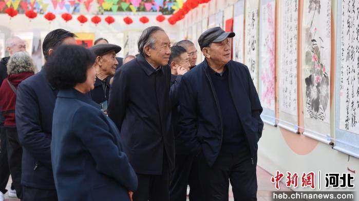 图为在宁晋县上城嘉苑社区重阳节银龄作品书画展上,老人们正在欣赏字画作品。 李策 摄