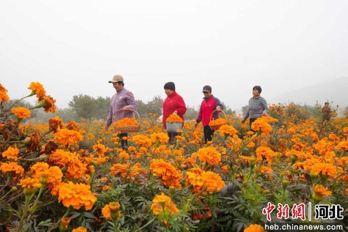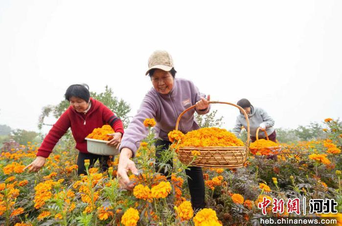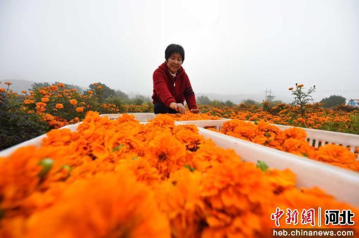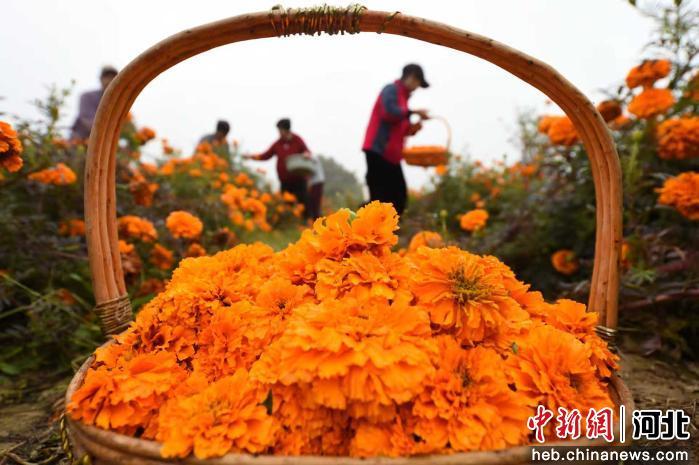 中新网河北新闻10月31日电 (王天译 王洪超)31日上午,河北省邯郸市复兴区东高河村万寿菊种植基地,村民们正忙着采摘、分拣、装筐。