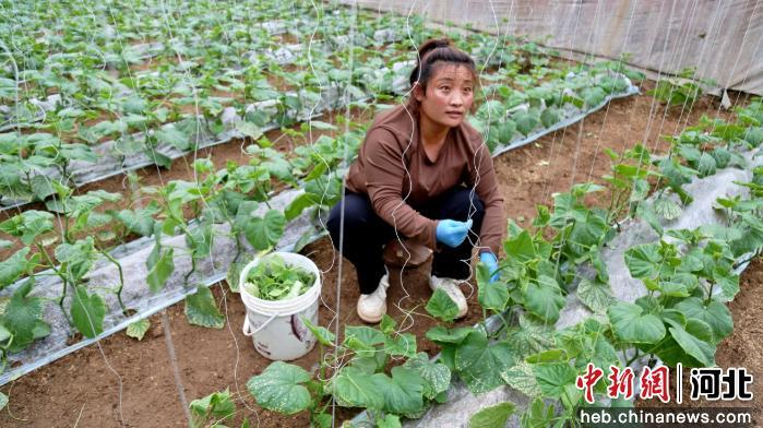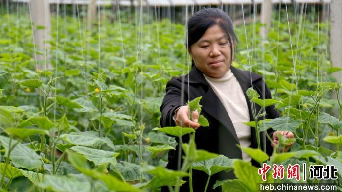 图为农户在缠黄瓜秧。 郭江鹏 摄