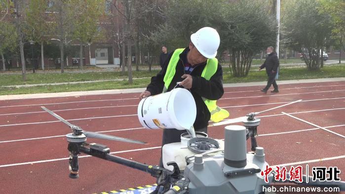 图为比赛选手赛前为植保无人机加水。 王晓慧 摄