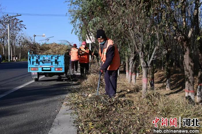 图为养护人员在S347省道河北省邯郸市广平县段清理路肩枯枝。 刘翠翠 摄