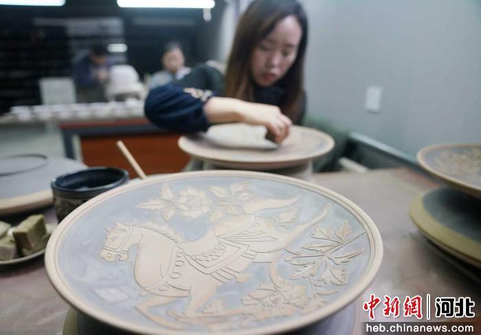 图为峰峰矿区磁州窑匠人正在制作马年主题陶瓷产品。 李栋 摄