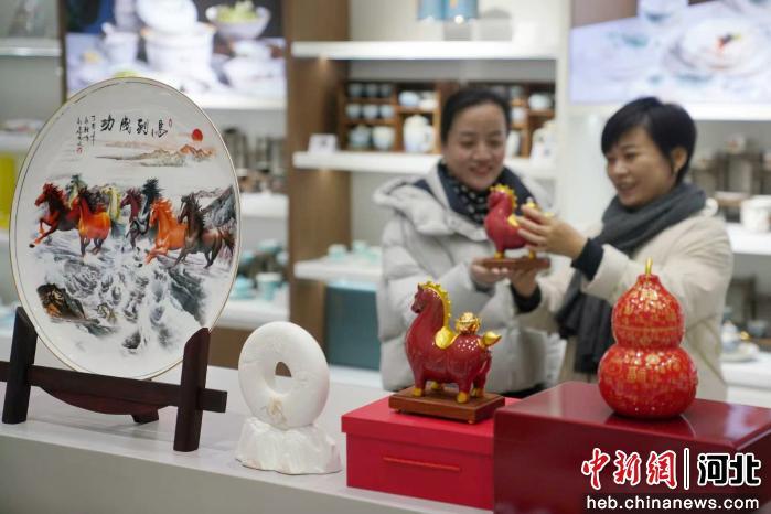 图为市民在峰峰矿区一家陶瓷企业的展厅挑选马年主题陶瓷产品。 李栋 摄