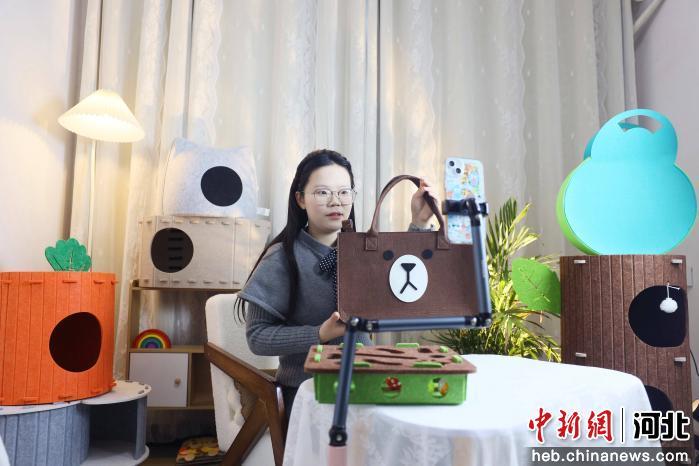 图为在南宫市薛吴村乡杨家头村一家毛毡制品生产企业,工作人员通过直播平台销售毛毡制品。 田优 摄