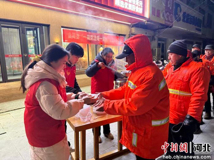 图为青年志愿者将八宝粥送到环卫工人手中。 张彤 摄