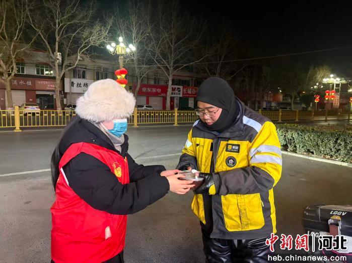 图为青年志愿者为外卖配送员送上暖心八宝粥。 张彤 摄