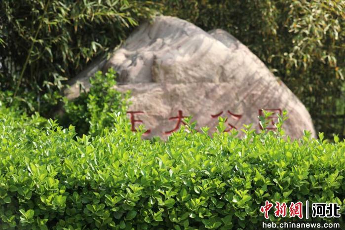 图为绿色植被环绕中的正大公园石刻。 靳东凯 摄