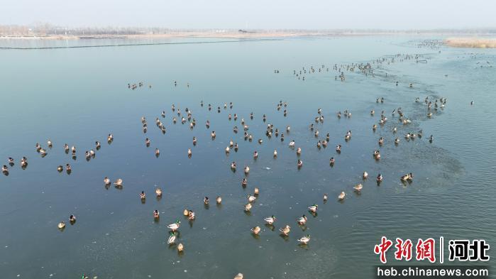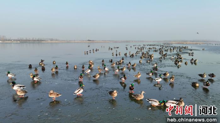 中新网河北新闻2月3日电 (王林)冬日的南宫湖上,成对的鸳鸯并肩嬉戏,上千只琵嘴鸭结群旋转,斑头秋沙鸭在水面上悠然游弋,成千上万只花脸鸭、绿头鸭,或悠然戏水,或觅食栖息,或展翅飞舞、相互追逐。苍鹭舒展长翼盘旋翩跹,悠扬的鸣叫声回荡在湿地上空,勾勒出一幅灵动秀美的冬日生态画卷。