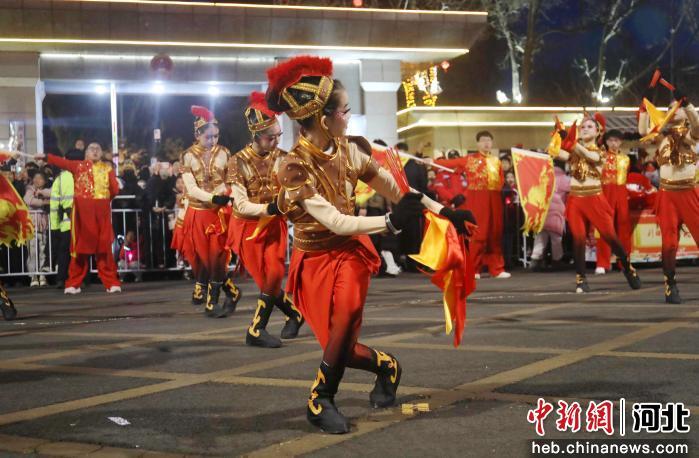 无人机表演余韵未消,10道花会巡游队伍沿新中街自西向东表演前行。9面大鼓擂响《万马奔腾》,舞狮腾跃、杠桥翻飞,大头娃娃、小车会、登云会、小驴会等民间绝活轮番上演,灯笼舞与腰鼓队红火压轴,现场叫好声、掌声此起彼伏。
