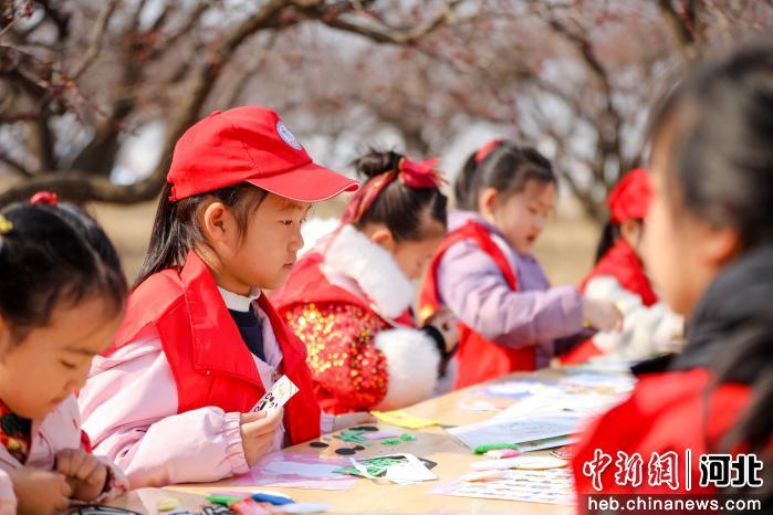 图为小学生在杏林里开展手工创作。 陈康 摄