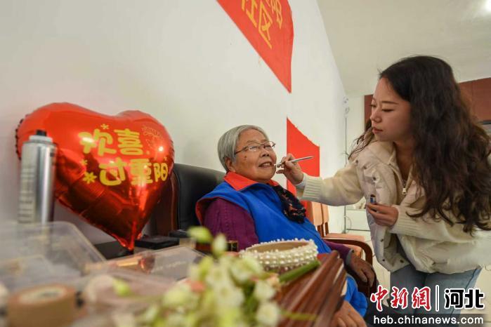 图为在罗三社区,邯郸市群众艺术馆工作人员为老年人化妆。  李燊 摄