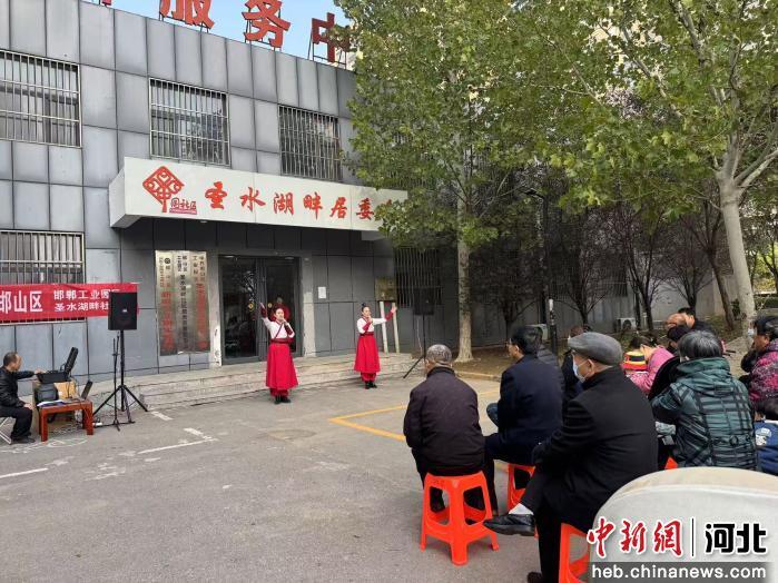 图为在圣水湖畔社区,文艺志愿者正在为老年人进行诗朗诵表演。 栗梦月 摄